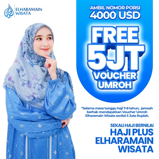 Selama masa tunggu, Anda mendapatkan voucher umrah senilai Rp5 juta sebagai hadiah eksklusif dari Elharamain Wisata.